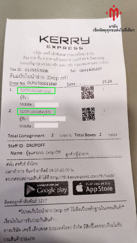 ตรวจสอบให้แน่ใจว่าเลขพัสดุของท่านถูกต้อง เลขพัสดุของเคอรรี่ เอ็กซ์เพรส จะมีจำนวน 13-15 หลัก เช่น SDOF10000671510 จะอยู่ทางด้านซ้ายมือในสลิปใบเสร็จ ดังกรอบสีเขียวดังรูป