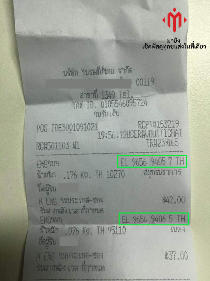 - ตรวจสอบให้แน่ใจว่าเลขพัสดุของท่านถูกต้อง เลขพัสดุไปรษณีย์ไทยจะมี 13 หลัก เช่น EL965694057TH จะอยู่ทางด้านขวามือในสลิปใบเสร็จ ในกรอบสีเขียวดังรูป